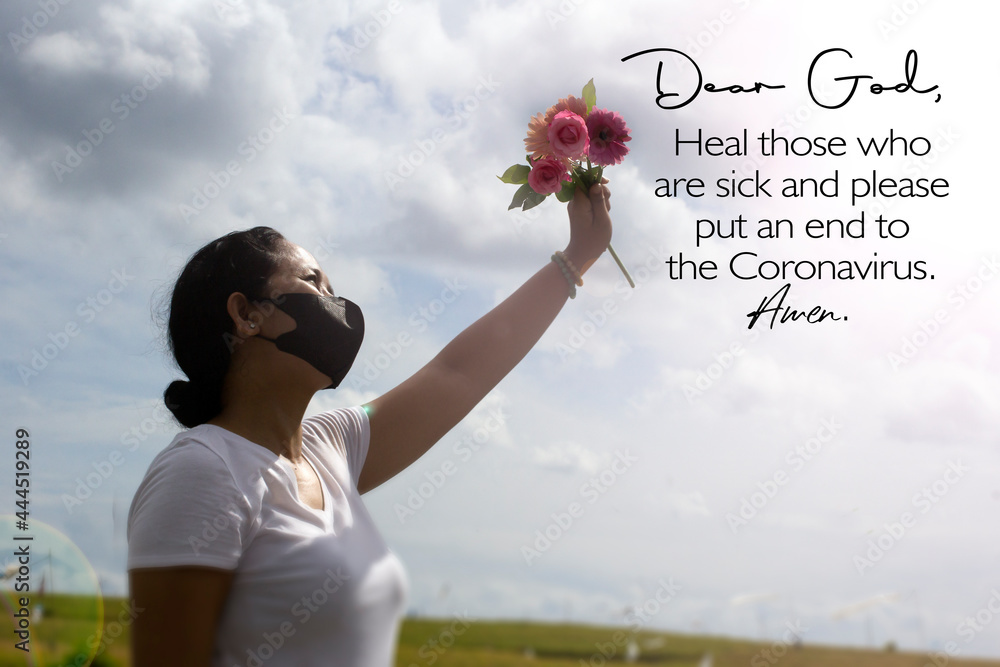 Dear God, Heal those who are sick and please put an end to the Coronavirus. Amen. With woman wearing face mask praying by showing a bouquet of pink flowers in a raised hand on summer sky background.