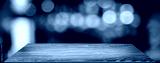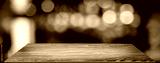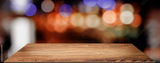 nightclub background.Empty brown wooden table with blur bar restaurant bokeh lights,banner mockup template for display of product