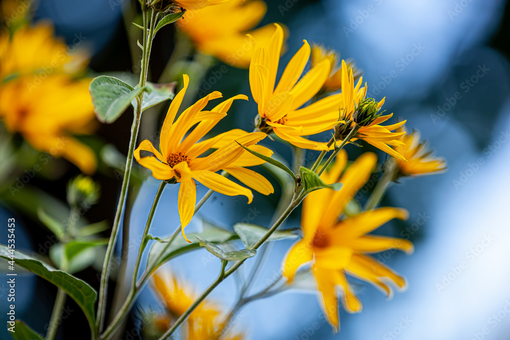 Jerusalem artichoke is an ornamental, forage and cultivated plant - beautiful yellow flowers on a blue background. Blooming perennial - autumn