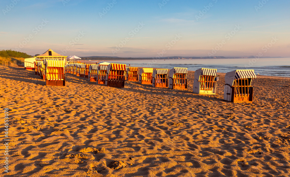 Swinoujscie. Beach cabins on the shores of the Baltic Sea in the early morning.