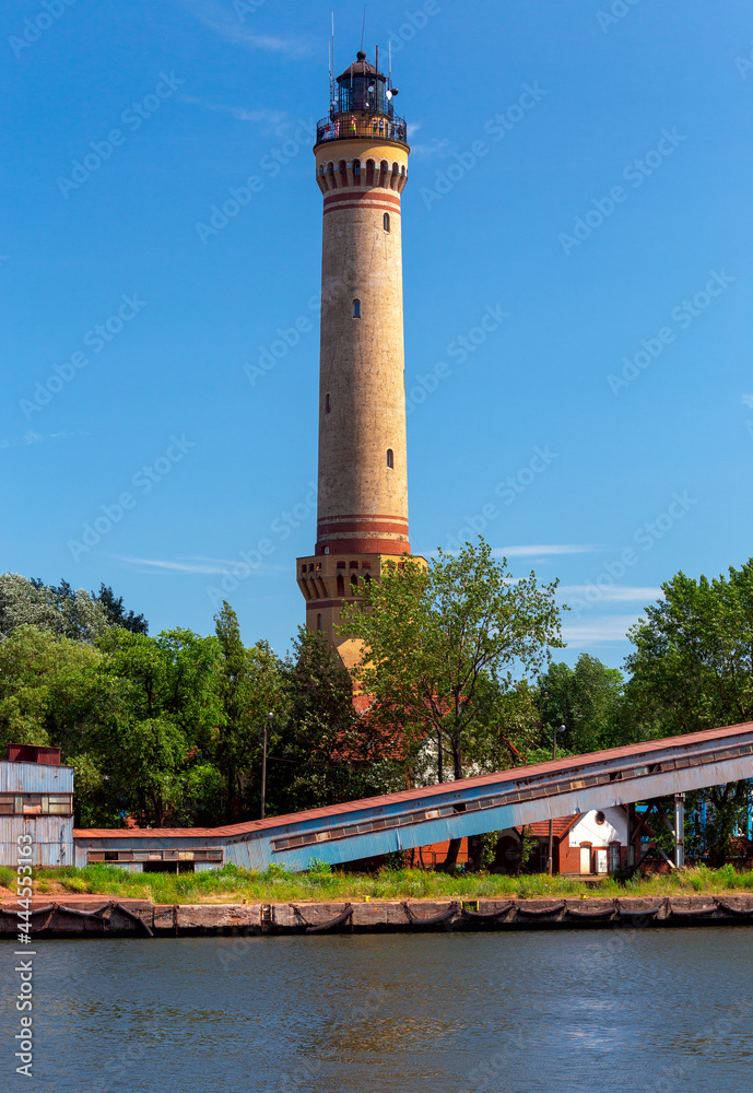 Swinoujscie. Old stone lighthouse on a background of blue sky.