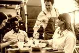 Happy people having fun eating at food truck restaurant outdoor in the city - Focus on waiter face