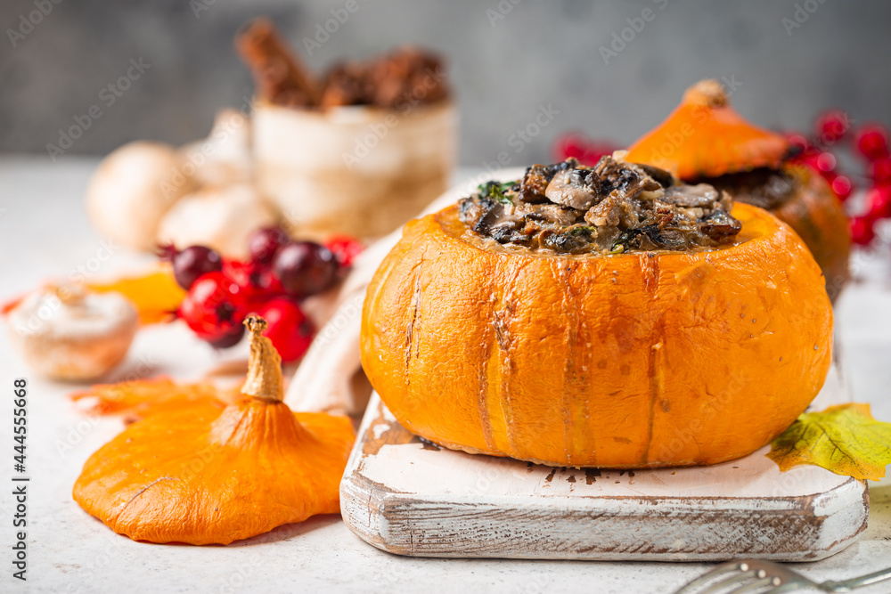 Tasty autumn stuffed pumpkin with fresh mushrooms, spinach and vegetables ready on rustic white table