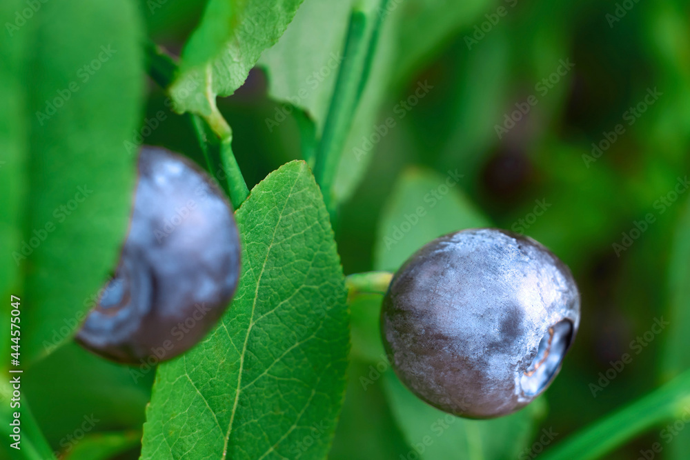 Ripe blueberries growing on a bush in nature.