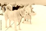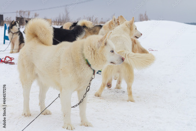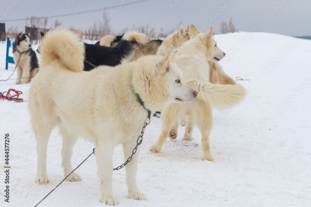 Husky dogs are tied on leashes in winter waiting for a trip in the snow on