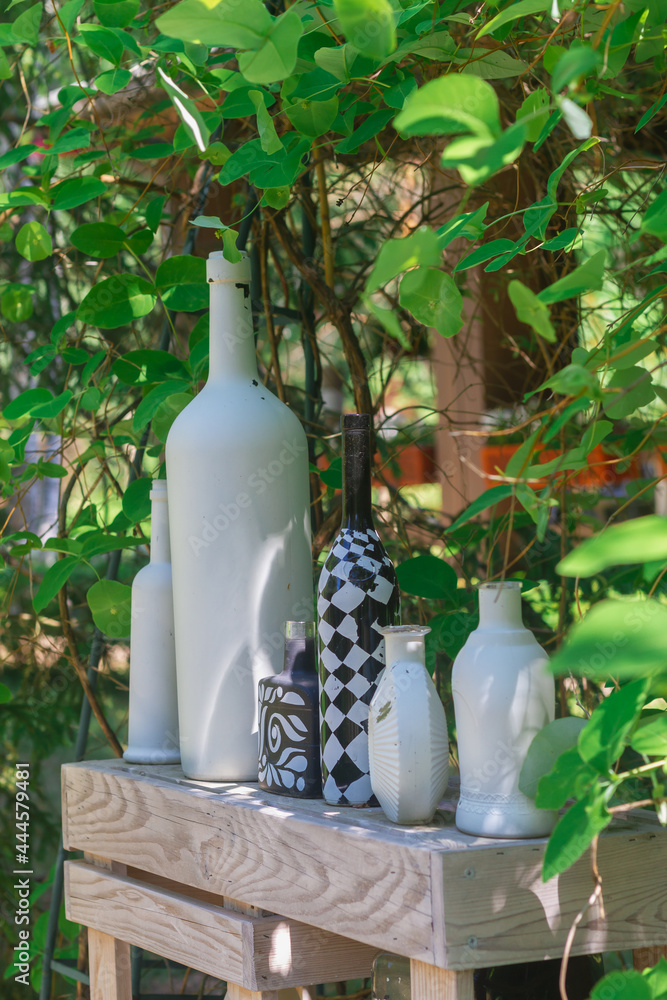 Decorative black and white vases and bottles on a wooden stand in the park in summer