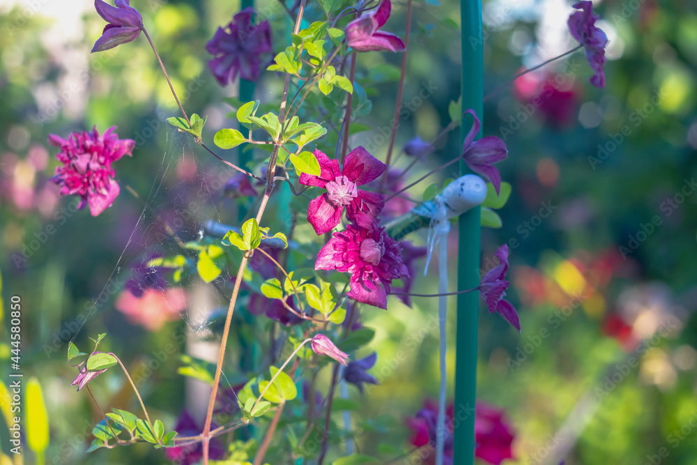 Purple clematis flowers on the support curl in summer