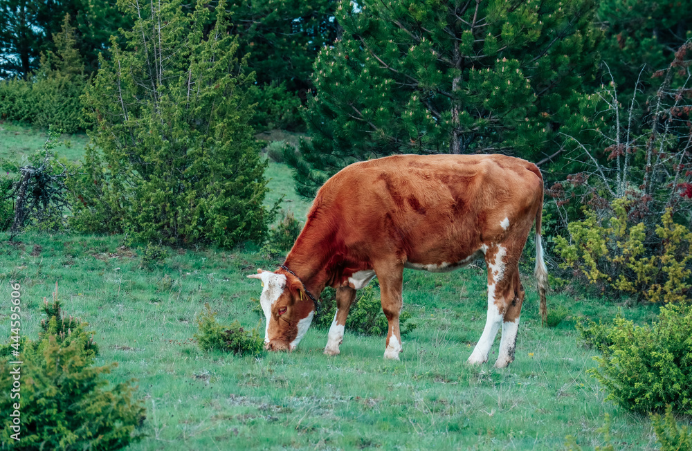 Pretty healthy, nice, good brown cow in the field. Ecology farming.