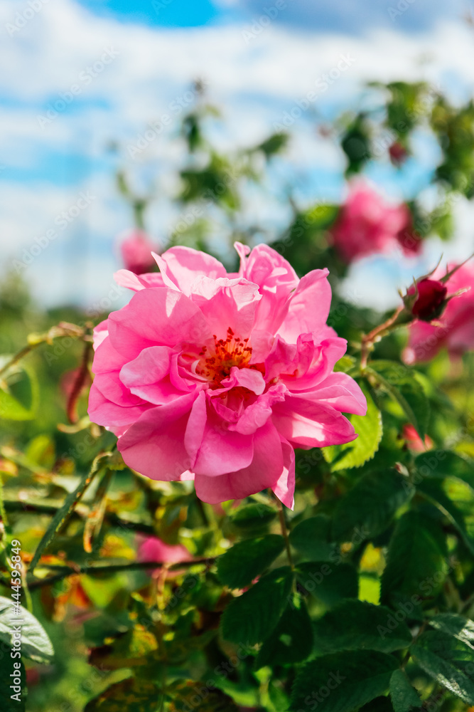 Bulgaria, rose plantation valley. Rosa damascena farm, rosebush.