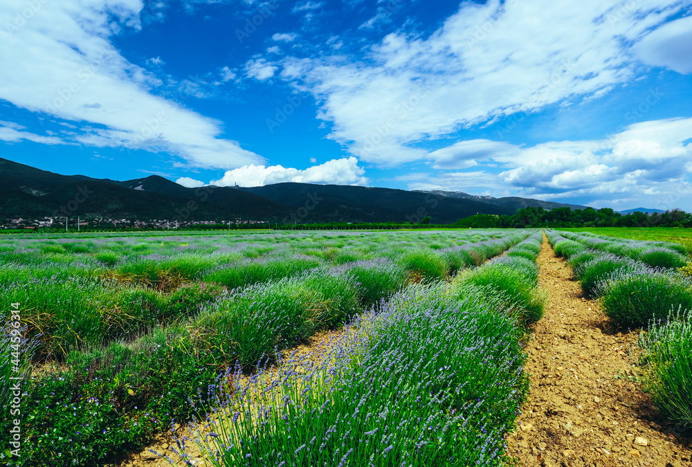 Beautiful violet wild Lavender backdrop meadow close up. French Provence field of purple lavandula herbs blooming. lawanda, lavander plantation