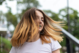 Outdoor portrait of a young woman with flying hair. Motion blur.