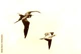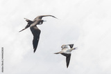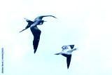 Frigate bird fighting with gannet. Birds fighting in sky.