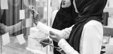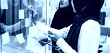 Two muslim business woman planning and brainstorm writing over the project with stickers note on glass window at modern office.Teamwork concept