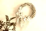 Macrame wreath with big cotton flower on a white decorative plaster wall. Natural cotton thread and rope. Eco decor for home. Creative greeting card for a creative person.