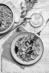 Fregula with seafood, traditional Sardinian pasta consists of semolina dough and toasted in an oven.