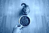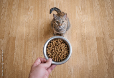 Male hand with dry food. The cat is waiting to be fed. Top view.