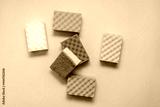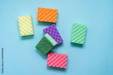 Cleaning colorful sponges on blue background. Top view minimal style. Spring cleaning concept. Household tools for dishes.