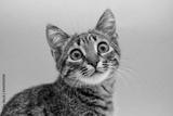 Closeup kitten tabby grey portrait. Big eyes and cute face. Pet cat portrait on blue background. Ophthalmologic veterinarian animal disease. Vet medicine