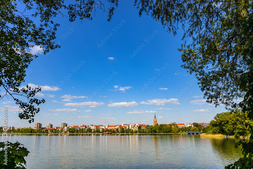 Panorama of Elk historic city center with Holiest Heart of Jesus neo-gothic church tower on shore of Jezioro Elckie lake in Masuria region in Poland
