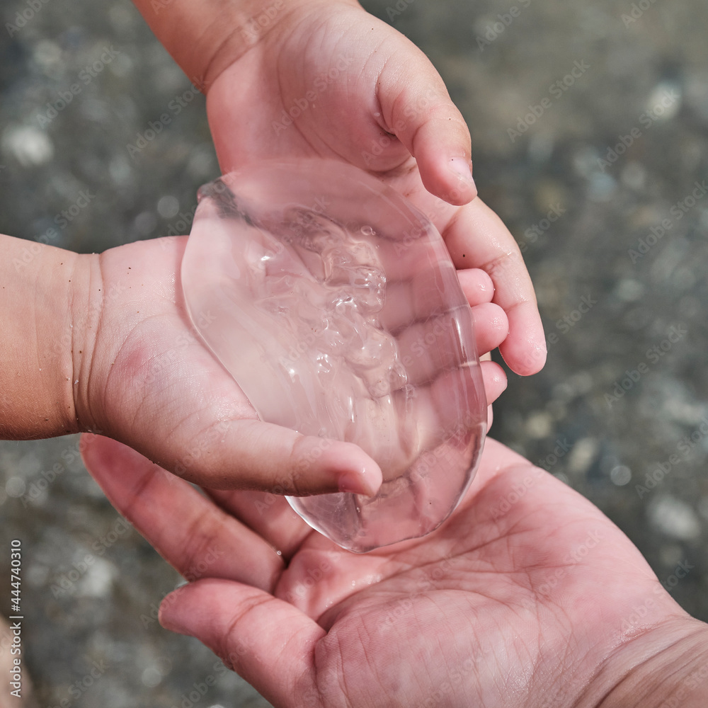 Child's hands are giving into hand of mother a small transparent jellyfish