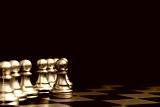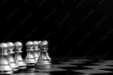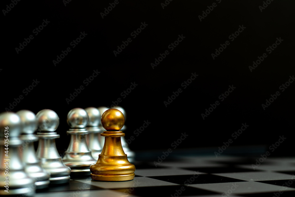 Gold pawn piece stand in fron of silver pawn team on black background (Concept for leader, unique or outstanding)