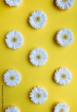White gerbera flower daisy buds arranged in a pattern on trendy yellow colour background. Creative spring flat lay composition in top view with copy space.