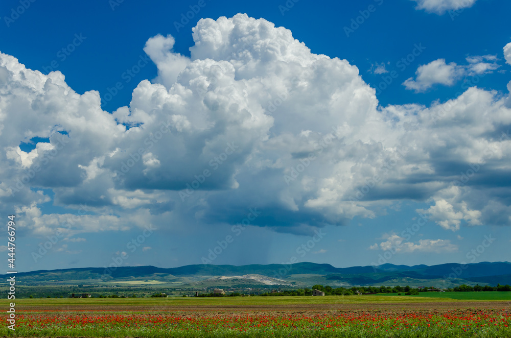 Mountains covered with forest in summer with clouds.