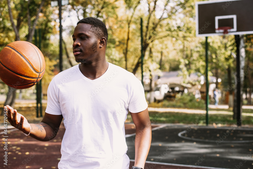 Portrait of a handsome black young man holding a basketball on a basketball court. Take a break during your workout. Fashionable sports portrait