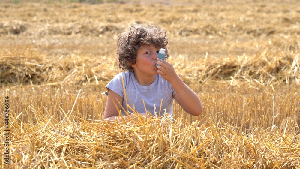 Little European caucasian children has allergies from flower pollen in freshly cut wheat field, boy has running nose in flower field and wipe his nose by tissue paper