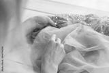Light satin fabric with girl on wooden background with beads.