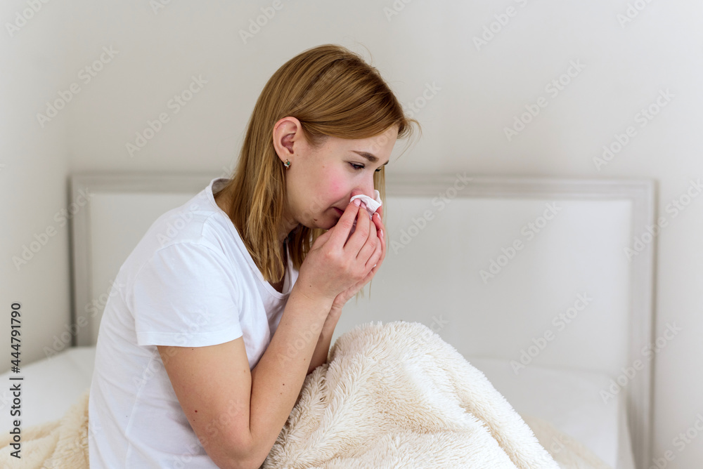 Sick millennial woman feeling bad, weak fight against flu, runny nose, rest at home, health problem concept. The woman blows her nose into a handkerchief. depression, sadness and crying