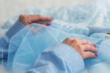 Woman with blue satin fabric with threads on a wooden background with beads.