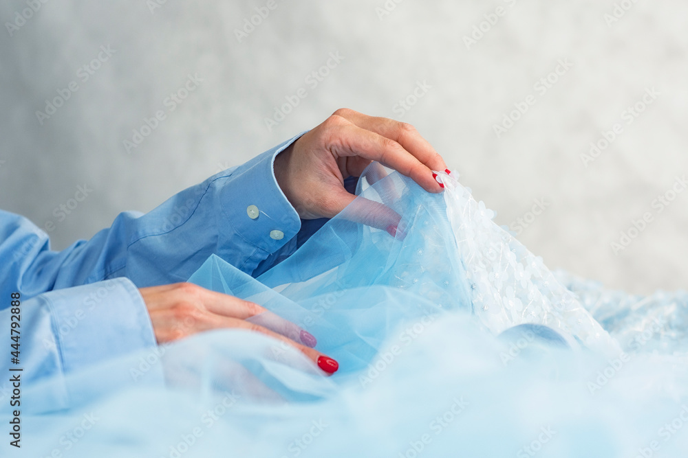 Woman with blue satin fabric with threads on a wooden background with beads.