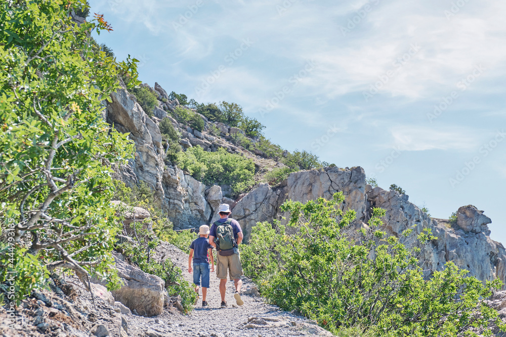 Boy and man hiking on scenic Golitsyn trail. National botanical reserve New World, Crimea.