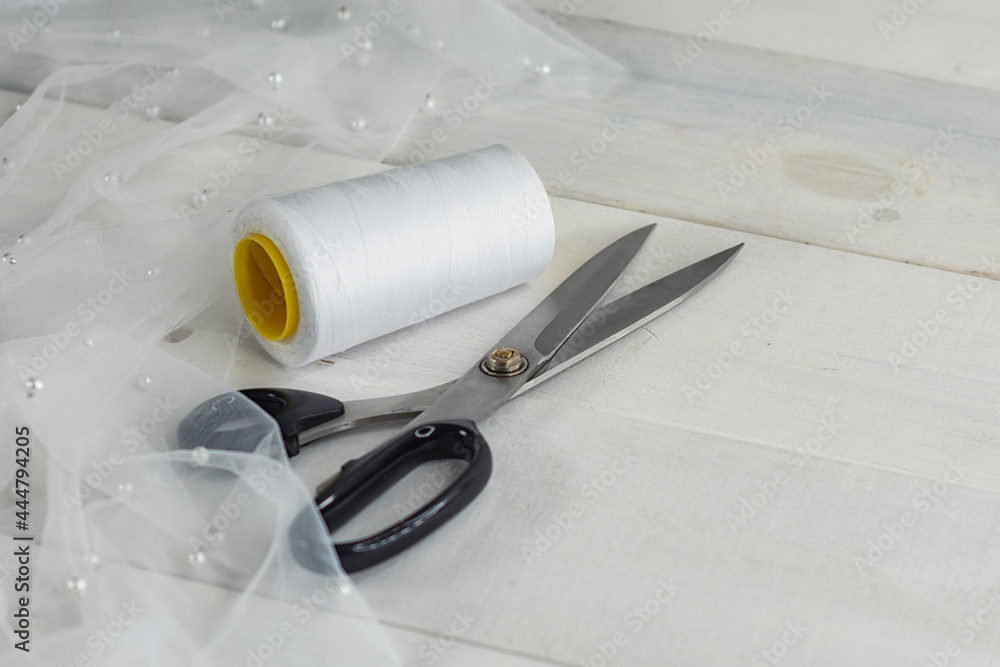 Lightweight satin fabric with threads and scissors on a wooden background with beads.