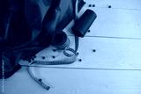 Pink satin fabric with thread and centimeter on wooden background with beads.