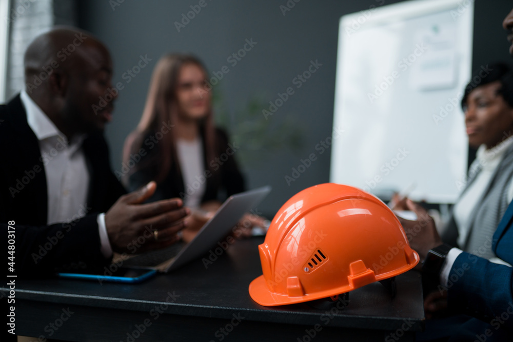 Photo from the side. Construction helmet lying on the table against the background of African American businessmen and women office workers
