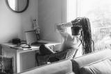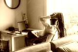 View from behind of a black female shaking her long braids with hands while sitting in the living room of her house in a wicker chair and looking outside the window, a laptop and a coffee on the table