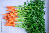Farm fresh carrots with green leaves. Healthy organic vegetables on gray background. Fresh harvest from the market. Flat lay backdrop in top view.