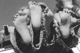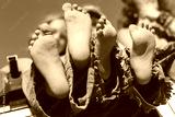 children's bare feet in torn pants bottom view