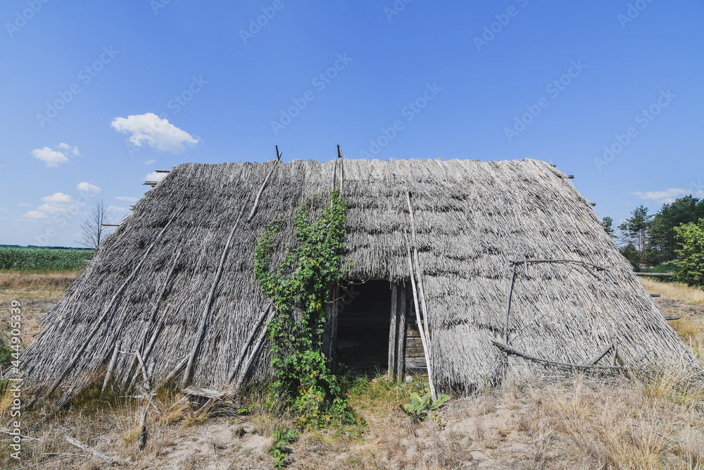 Old rustic wooden Slavian hut with roof made of straw in Svalovychi village in Ukraine.