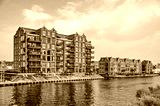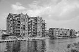 Oegstgeest, The Netherlands, July 11, 2021: recently built residential buildings on the banks of the river Oude Rijn, imitating the looks of converted old warehouses