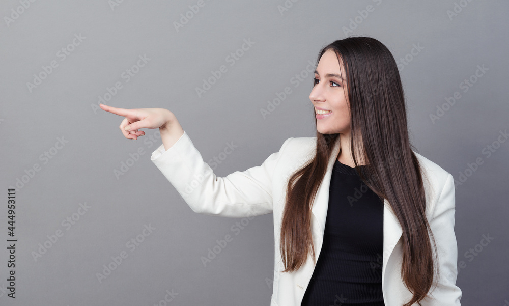 woman with long hair in a white jacket smiles , points to the side on a gray