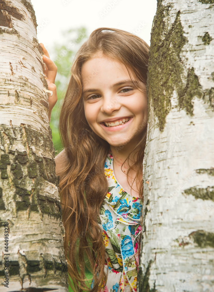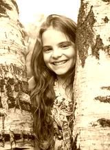 teenage girl smiles, trees