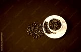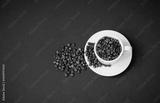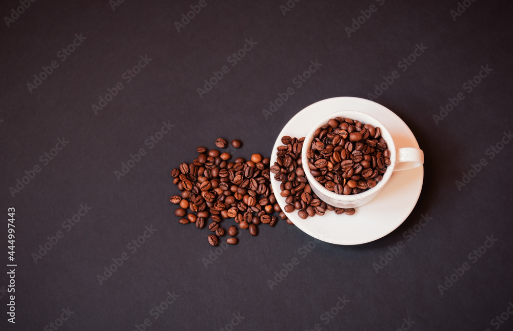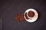 Coffee cup with roasted coffee beans on dark background.