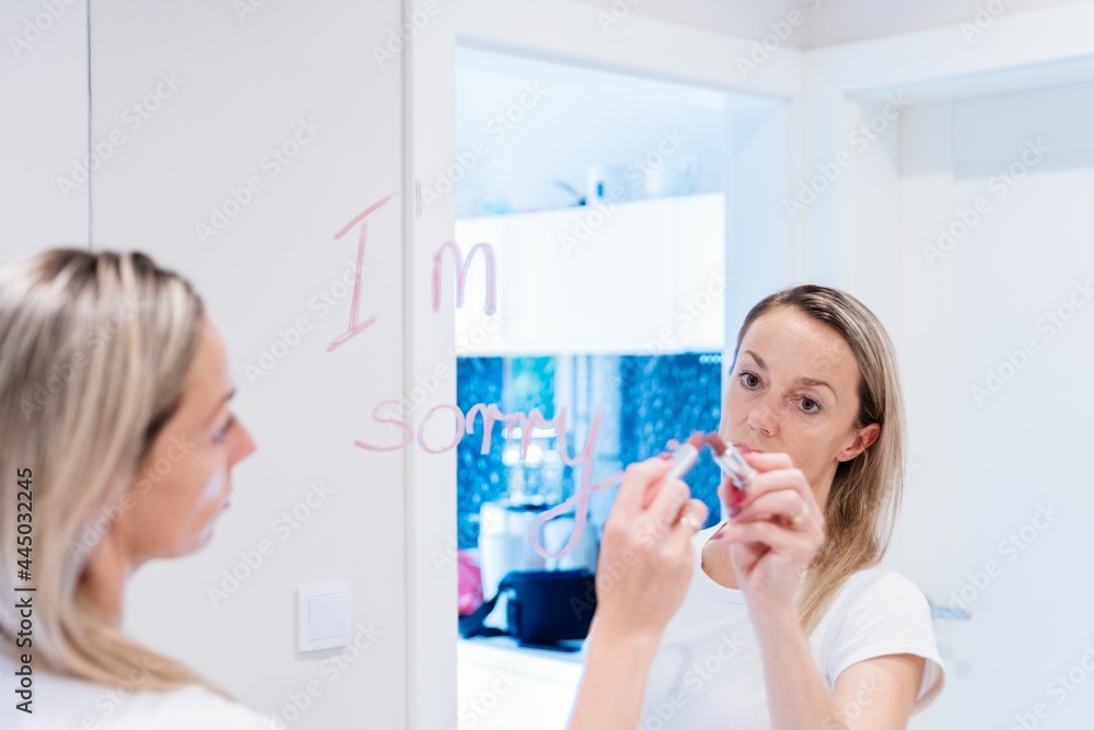 Inscription I'M SORRY by lipstick on mirror and reflection of a blonde woman.