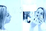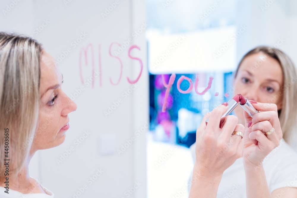 Blonde woman in white t-shirt writes the words I miss you on the mirror.