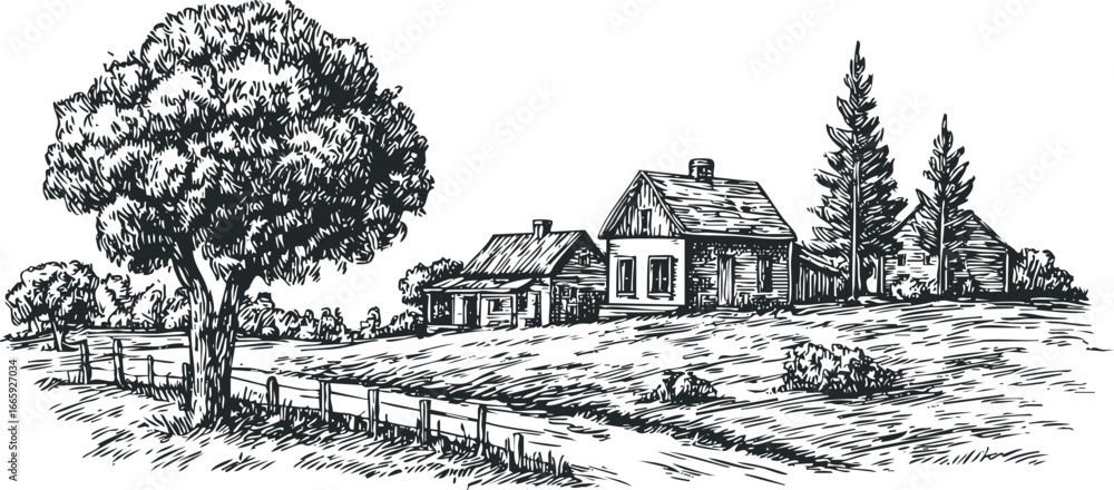 Rural homestead with rustic cabin and trees sketched in black ink