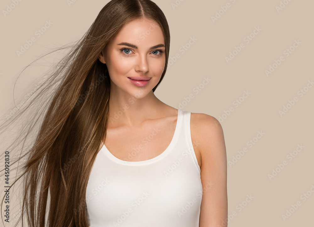 Beautiful woman with long smooth brunette hair clean beautiful skin