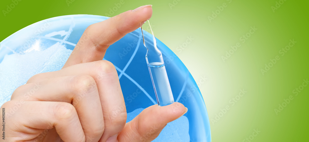 Medical ampoule for injection in hand on blue Earth globe and green background